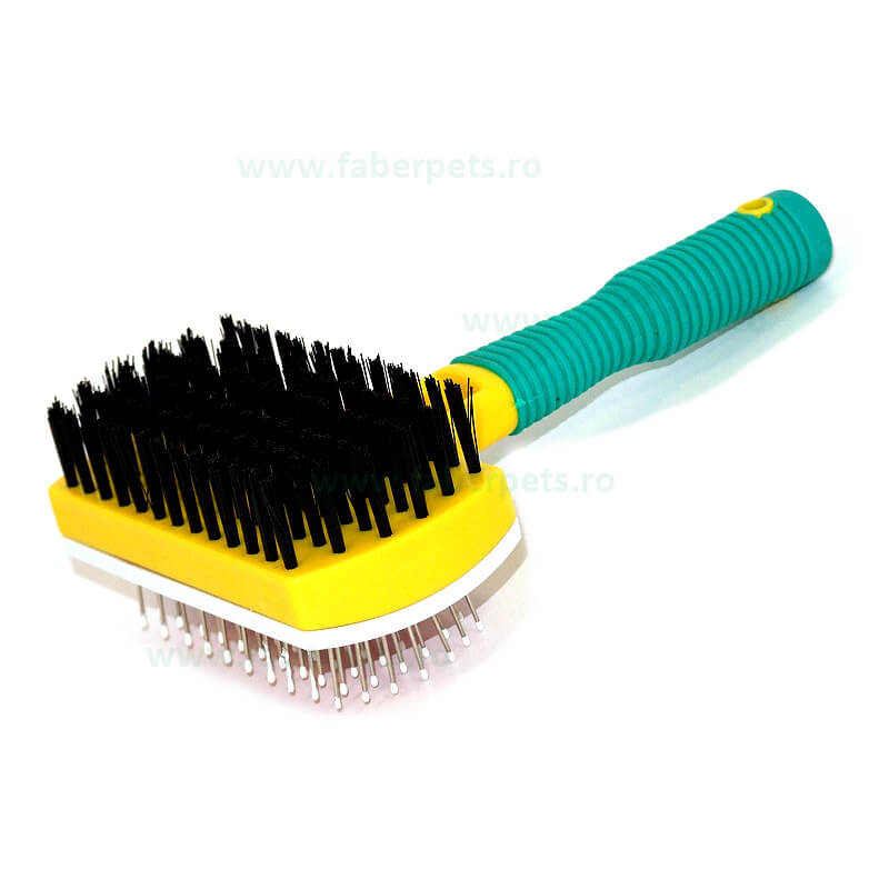 Această perie cu păr moale pe o parte, iar pe cealaltă parte – fire de oțel prevăzute la capete cu biluțe, pentru a nu deranja pielea. Descâlcire profundă și eficientă datorită rândurile de dinți. Peria are două funcții: partea cu firele de oțel prevăzute cu biluțele în capăt – de a masa pielea animalului precum și de a stimula circulația sanguină; partea cu păr nylon moale, garantează o blană bine îngrijită și strălucitoare. Ideală pentru câini cu părul mediu sau lung. Mâner ergonomic, anti- alunecare pentru confort și control maxim. Lățimea țesalei – 10 cm. Lungimea țesalei – 17 cm. Ghid de utilizare perie:Asigurați- vă că blana câinelui dvs. este complet uscată. Periați încet animalul dvs. în sensul creșterii părului. Faceți mișcări lungi și suple și evitați să treceți de mai multe ori în același loc. La periere acordați o deosebită atenție zonelor mai sensibile ale animalului Dvs. (burta, labe, părți genitale, anus). O periere prea apăsată sau repetată poate irita pielea. Dacă remarcați o iritare sau înroșire a pielii încetați imediat să folosiți peria. Evitați să vă sprijiniți pe animal atunci când îl pieptănați.