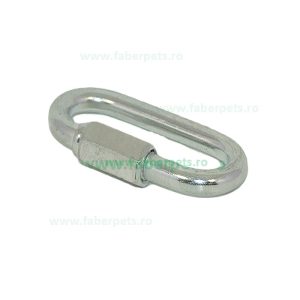 Este fabricată din oțel de calitate. Galvanizat pentru creșterea duratei de viață. Folosită pentru prinderea și asigurarea a diverse obiecte, precum lanțuri, chei, chingi, frânghii, etc. Nu dispune de închizător cu arc, închiderea realizându- se prin înfiletare. Lungime: 65 mm Sarcina maximă de încărcare: 150 kg Se vinde ambalat câte 5 buc/set! Prețul afișat este per buc!