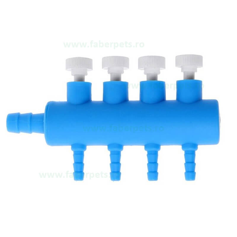 Produs profesional confecționat din material plastic. Facilitează distribuirea aerului la 4 obiective. Diametrul intern intrare furtun principal: 4 și 8 mm. Diametrul celor 4 ieșiri: 4 mm.