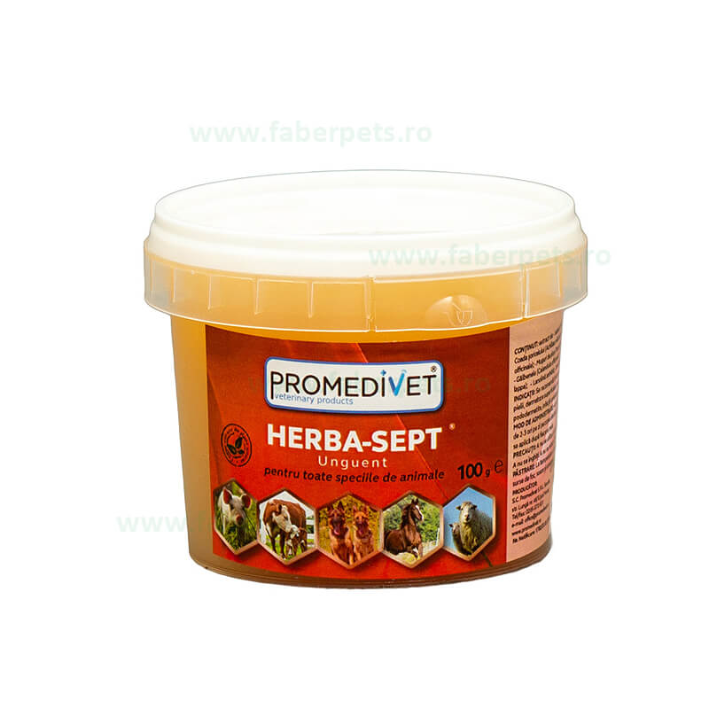 Proprietăți: Herba- sept simplu este un unguent, care conţine un amestec de extracte vegetale alcoolice şi acid salicilic încorporate într- o bază de unguent alcătuit din lanolină şi vaselină cu proprietăţi vehiculante, şi protectoare. Se recomandă folosirea la toate speciile, ca adjuvant în plăgi, infecţii ale pielii, dermatoze superficiale, arsuri, în tratarea afecţiunilor podale, panariţii, pododermatite, infecţii ombilicale şi infecţii cutanate mamare. Mod de utilizare:Uz extern, ca adjuvant în cazul plăgilor, rănilor se aplică de 2- 3 pe zi pe zona afectată, până la vindecare. Pentru întreţinerea pielii ugerului, se aplică după fiecare muls. Ingrediente:Extract de: – Iederă (Hedera helix) – Sunătoare (Hypericum perforatum) – Coada şoricelului (Achillea millefolium) – Tătăneasă (Symphytum officinale) – Muguri de plop (Populus nigra) – Jaleş de grădină (Salvia officinalis) – Gălbenele (Calendula officinalis) – Pătlagină (Plantago major) – Brusture (Arctium lappa) – Acid salicilic;Precauții:A nu se utiliza în afecţiuni oculare. A nu se lăsa la îndemâna copiilor. A nu se înghiţi. A nu se refolosi flaconul după golire. Prezentare:100 gr