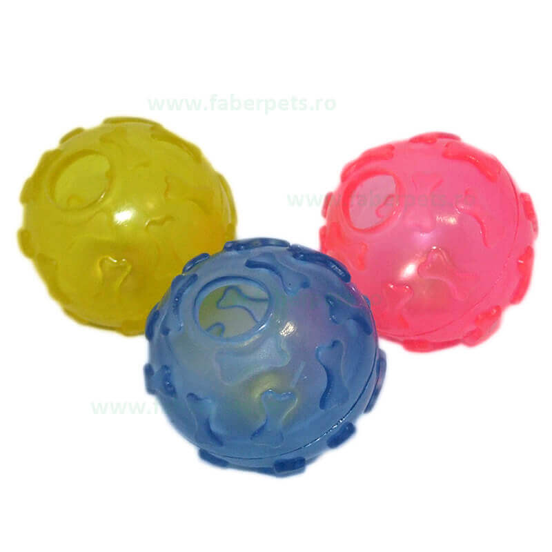 Jucăria este confecţionată din cauciuc, material ce foarte rezistent la intemperii şi durabil. Acest material uşor elastic şi non- toxic, este deosebit de prietenos cu dinţii câinelui dumneavoastră. Jucăria le oferă câinelui o ocupație, fiind și un obiect de ros, în același timp. Clopoțelul în interiorul mingii dă sunetul potrivit pentru jucărie. Câinilor le place să alerge, să prindă și să aducă jucăriile. Potrivită pentru toate vârstele, de la căţeluşi la seniori. Ușor de igienizat. Diametru: 7 cm. IMPORTANT: Acest produs este disponibil în diverse culori, așadar nu putem garanta livrarea unei anumite culori.