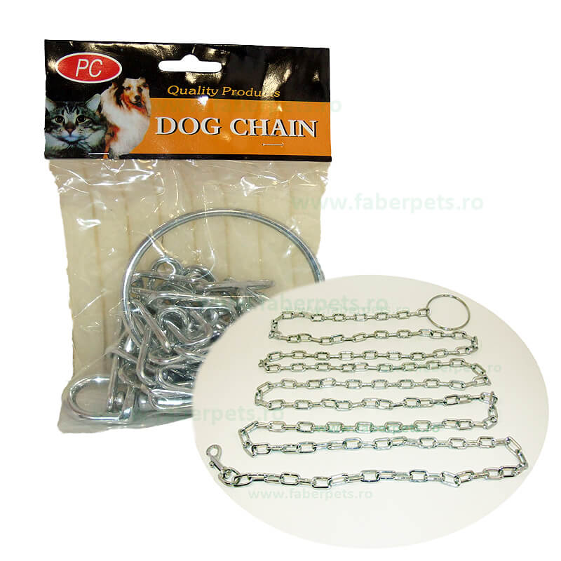Lanț confecționat din oțel rezistent cu zale sudate, ideal pentru legat câinele în curte. Puteți imobiliza ușor și în siguranță cățelul prin intermediul acestui lanț. Nu se răsucește fiind prevăzut cu un inel și cu o carabinieră cu rezistență mult peste cea necesară. Lanțul este compus din zale lung de 35 mm și gros de 3. 1 mm. Lungimea maximă desfășurată este de 2 m. Recomandat câinilor de talie mică. Atenție! Menținerea căinelui legat în lanț trebuie să fie limitată în timp și numai în situațiile care impun acest lucru. Un exemplar legat în permanență va prezenta modificări comportamentale grave ( devine agresiv cu toata lumea, inclusiv deținatorul, începe să latre excesiv, etc), care fac dificilă intreținerea câinelui și nu de puține ori, chiar coexistența cu animalul de companie.
