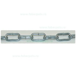 Lanț confecționat din oțel rezistent cu zale sudate, ideal pentru legat câinele în curte. Puteți imobiliza ușor și în siguranță cățelul prin intermediul acestui lanț. Nu se răsucește fiind prevăzut cu un inel și cu o carabinieră cu rezistență mult peste cea necesară. Lanțul este compus din zale lung de 30 mm și gros de 4 mm. Lungimea maximă desfășurată este de 5 m. Recomandat câinilor de talie medie. Atenție! Menținerea căinelui legat în lanț trebuie să fie limitată în timp și numai în situațiile care impun acest lucru. Un exemplar legat în permanență va prezenta modificări comportamentale grave ( devine agresiv cu toata lumea, inclusiv deținatorul, începe să latre excesiv, etc), care fac dificilă intreținerea câinelui și nu de puține ori, chiar coexistența cu animalul de companie.
