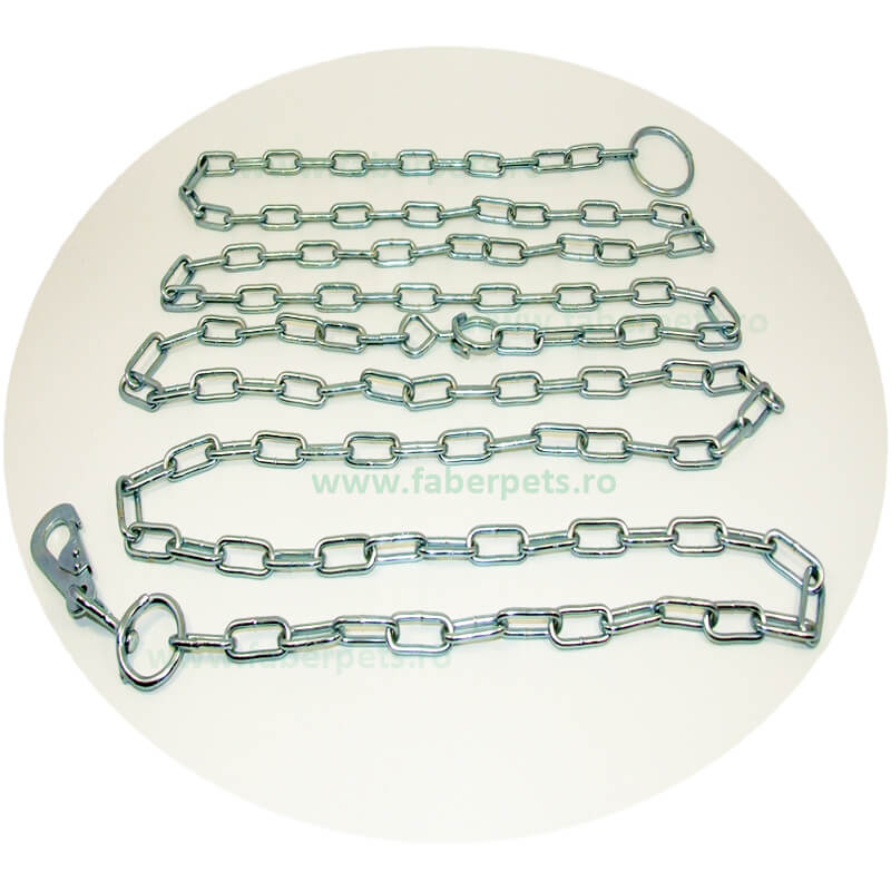 Lanț confecționat din oțel rezistent cu zale sudate, ideal pentru legat câinele în curte. Puteți imobiliza ușor și în siguranță cățelul prin intermediul acestui lanț. Nu se răsucește fiind prevăzut cu un inel și cu o carabinieră cu rezistență mult peste cea necesară. Lanțul este compus din zale lung de 45 mm și gros de 5 mm. Lungimea maximă desfășurată este de 4 m. Recomandat câinilor de talie mare. Atenție! Menținerea căinelui legat în lanț trebuie să fie limitată în timp și numai în situațiile care impun acest lucru. Un exemplar legat în permanență va prezenta modificări comportamentale grave ( devine agresiv cu toata lumea, inclusiv deținatorul, începe să latre excesiv, etc), care fac dificilă intreținerea câinelui și nu de puține ori, chiar coexistența cu animalul de companie.