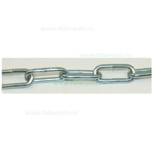 Lanț confecționat din oțel rezistent cu zale sudate, ideal pentru legat câinele în curte. Puteți imobiliza ușor și în siguranță cățelul prin intermediul acestui lanț. Nu se răsucește fiind prevăzut cu un inel și cu o carabinieră cu rezistență mult peste cea necesară. Lanțul este compus din zale lung de 45 mm și gros de 5 mm. Lungimea maximă desfășurată este de 5 m. Recomandat câinilor de talie mare. Atenție! Menținerea căinelui legat în lanț trebuie să fie limitată în timp și numai în situațiile care impun acest lucru. Un exemplar legat în permanență va prezenta modificări comportamentale grave ( devine agresiv cu toata lumea, inclusiv deținatorul, începe să latre excesiv, etc), care fac dificilă intreținerea câinelui și nu de puține ori, chiar coexistența cu animalul de companie.