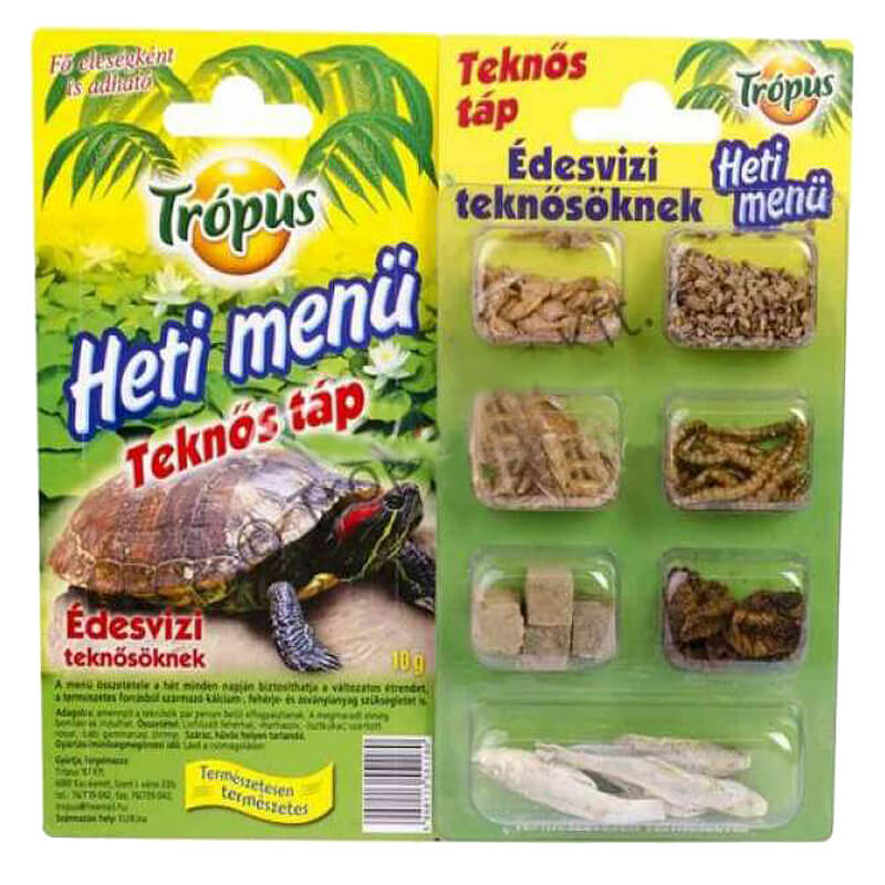 MENIU SĂPTĂMÂNAL pentru pești exotici și broscuțe este o hrană ideală pentru pești exotici și broscuțe, cu conținut foarte complex de nutritive și vitamine. Se administrează o cantitate cât se consuma în câteva minute. 7 compartimente. 7 tipuri diferite de hrană. Adaugând zilnic din diferite compartimente asigurați o dezvoltare echilibrată pentru pești de acvariu și broaștele țestoase. Se scufundă treptat la fundul apei.