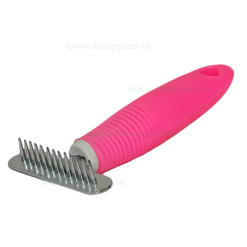Este un pieptăn pentru păr mic, păr încâlcit sau dificil de periat. Are dinți metalici fixați în suport. Descâlcire profundă și eficientă datorită rândului de dinți. Dinții au capetele rotunjite astfel nu vor irita pielea animaluțelor. este prevăzută cu un mâner ergonomic anti- alunecare, confortabil pentru aderență maximă. Lățimea pieptenei – 8 cm. Lungimea pieptenei – 14 cm. Ghid de utilizare perie:Asigurați- vă că blana câinelui dvs. este complet uscată. Periați încet animalul dvs. în sensul creșterii părului. Faceți mișcări lungi și suple și evitați să treceți de mai multe ori în același loc. La periere acordați o deosebită atenție zonelor mai sensibile ale animalului Dvs. (burta, labe, părti genitale, anus). O periere prea apăsată sau repetată poate irita pielea. Dacă remarcați o iritare sau înroșire a pielii încetați imediat să folosiți peria. Evitați să vă sprijiniți pe animal atunci când îl pieptănați.