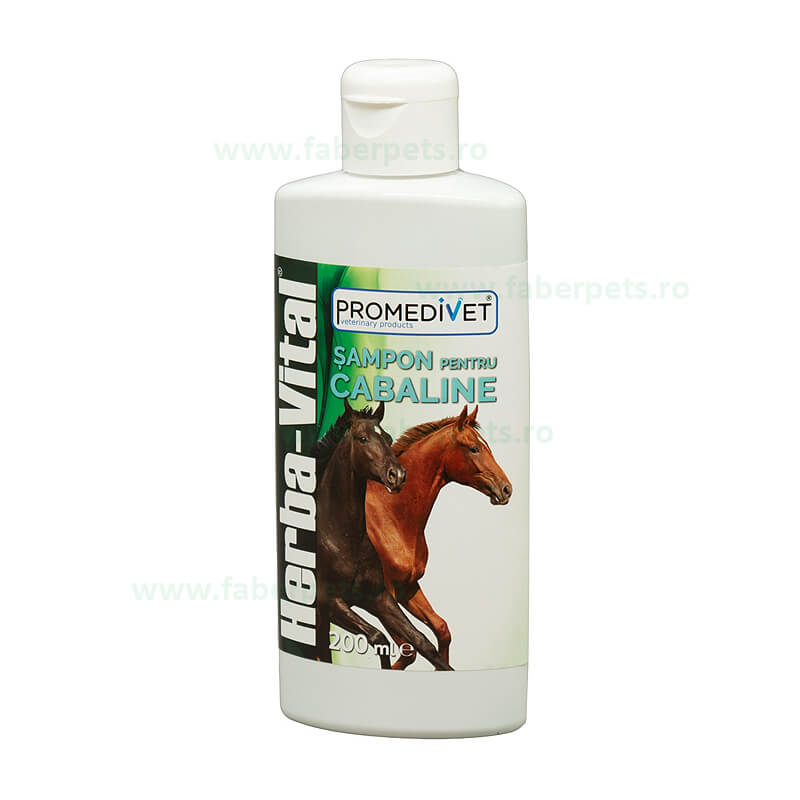 Șampon Herba- Vital pentru cabaline 200 ml Se recomandă pentru întreţinerea şi igienizarea părului la cabaline. Şamponul Herba- vital datorită compoziţiei are un efect nutritiv pentru epidermă şi firul de păr. Dă luciu şi strălucire părului. Combate căderea părului. Datorită componenţilor în lauriletersulfat de sodiu, cocoamidopropil- betain, cocodiethanolamid, (substanţe tensioactive – detergenţi), dizolvă şi emulsifică murdăria în lichidul de spălare. Parfumul din şampon are efect dezodorizant. Administrare uz extern, se umectează părul cu apă caldă, apoi se aplică şi se dispersează şamponul. După 5- 10 minute de acţiune, şamponul se îndepărtează prin clătire repetată cu apă caldă. Se usucă părul cu un prosop sau aer cald sau se ţine animalul în încăpere caldă până la uscarea părului. Se păstrează în ambalaje bine închise, ferit de surse de foc, soare şi umezeală, la temperatura camerei (15- 25 C˚). Valabilitate 2 ani, păstrat în ambalajul original, în condiţiile de păstrare prevăzute. Conține extract de:o BRUSTURE (Arctium lappa – radix)o MESTEACĂN (Betula pendula – folium)o COADA CALULUI (Equisetum arvense – folium)o NUC (Juglans regia – folium)o MUŞEŢEL (Matricaria chamomilla – flos)o JALEŞ DE GRĂDINĂ (Salvia officinalis – folium)o URZICĂ (Urtica dioica – radix et folium). Şamponul mai conţine lauriletersulfat de sodiu, cocodiethanolamin, cocoamidopropilbetain, acrilamid- dimetil- diallyl- amonium clorid, conservant, parfum, clorură de sodiu, apă. Precauții:A se evita contactul direct cu ochii şi zonele sensibile (organele genitale). A nu se lăsa la îndemâna copiilor. A nu se înghiţi. A nu se refolosi flaconul după golire.